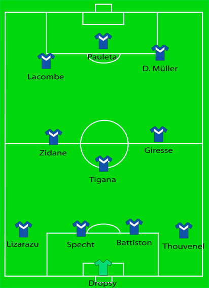Équipe-type : Dropsy, Thouvenel, Battiston, Specht, Lizarazu, Tigana, Giresse, Zidane, D. Müller, Lacombe, Pauleta.