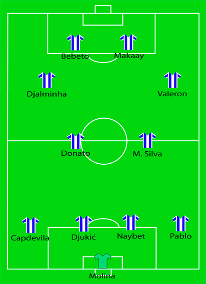 Équipe-type : Molina, Pablo, Naybet, Djukić, Capdevila, Mauro Silva, Donato, Valerón, Djalminha, Makaay, Bebeto.